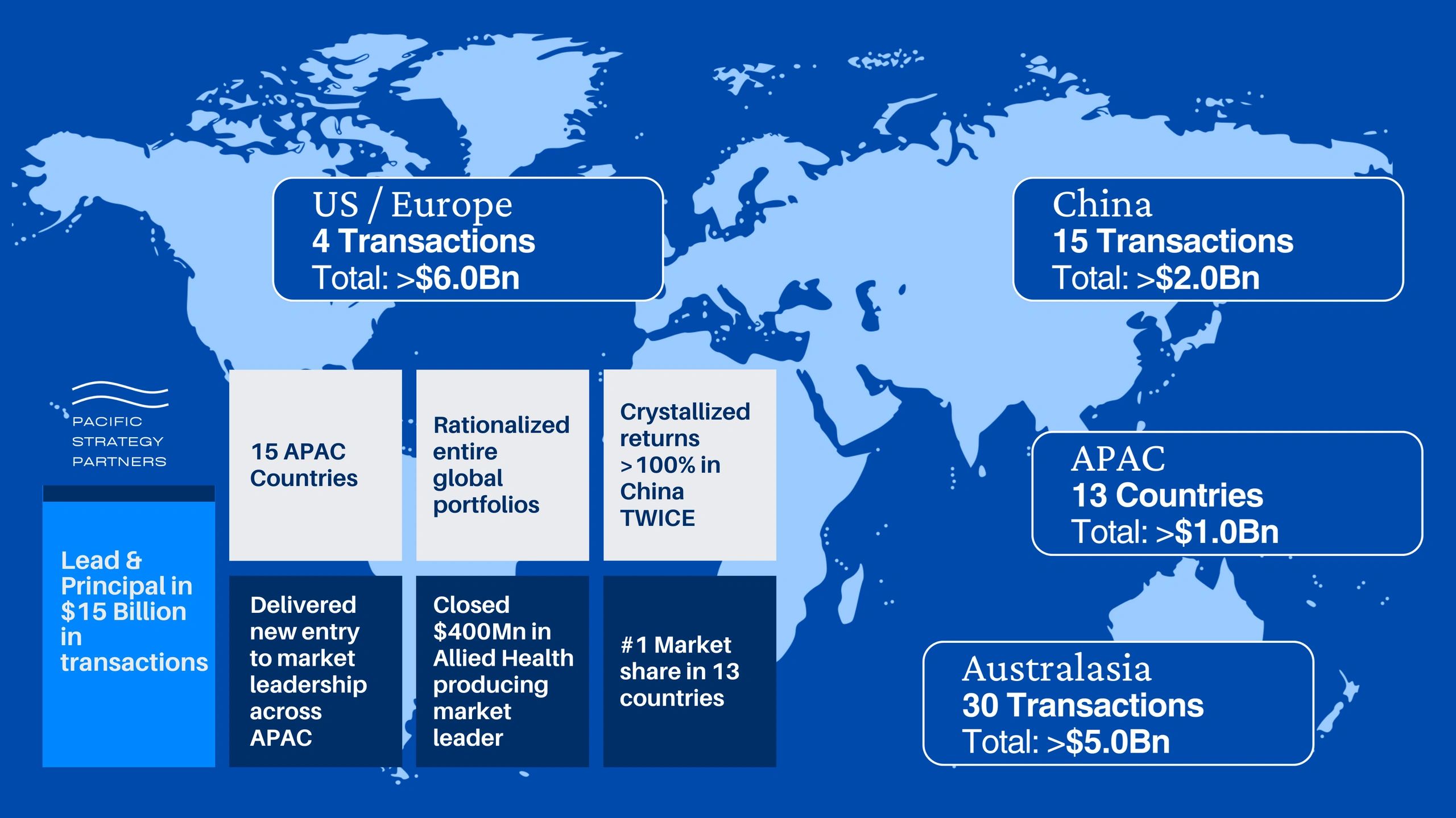 We‘ve served as both Lead & Principal on more than $15 Billion in transactions across 15 APAC countries and have delivered exceptional results, including realizing returns greater than 100% twice in China. Our strategies have been successfully deployed to gain and protect market leadership positions, drive operational improvements, and address challenges at every stage of the business cycle.